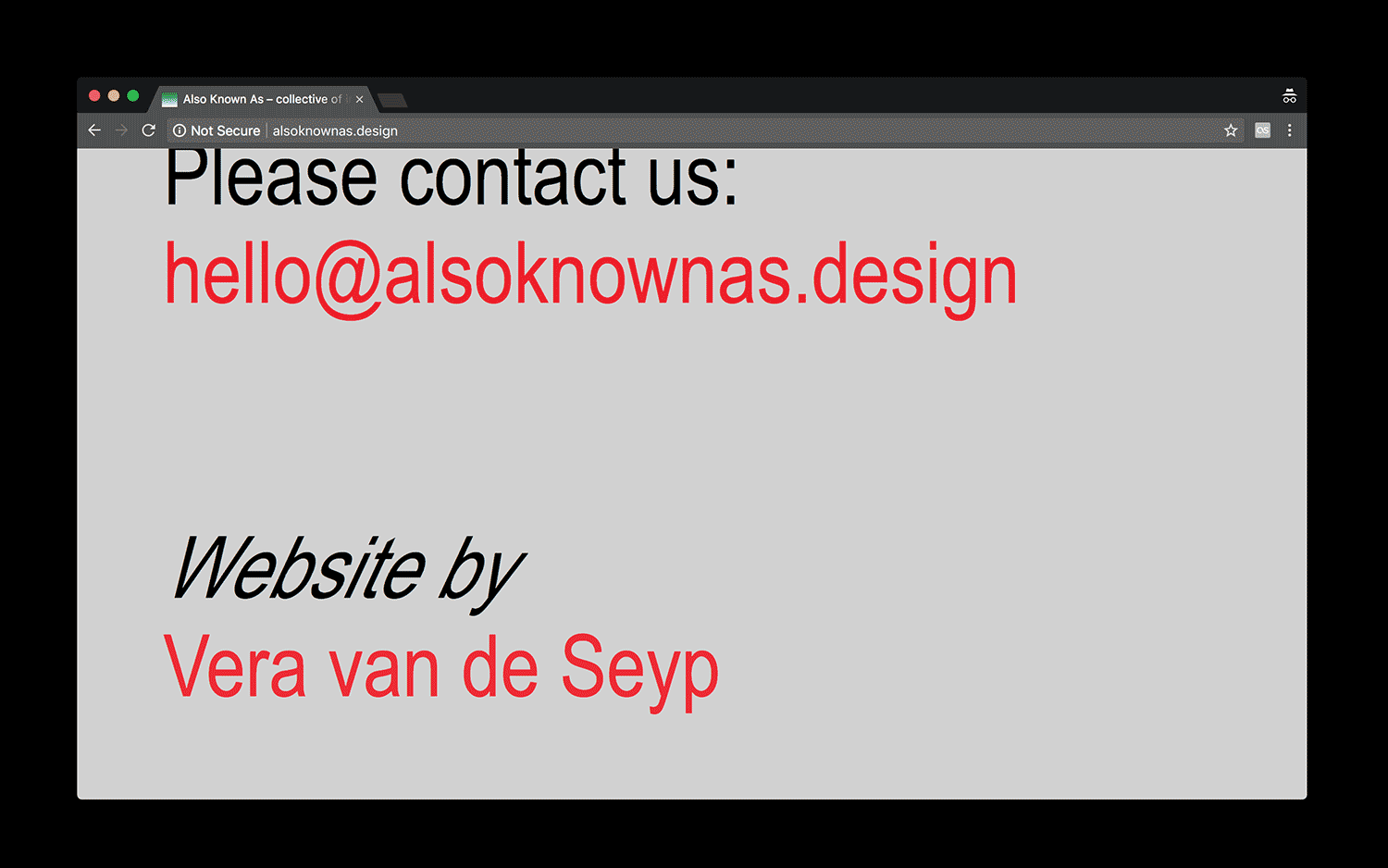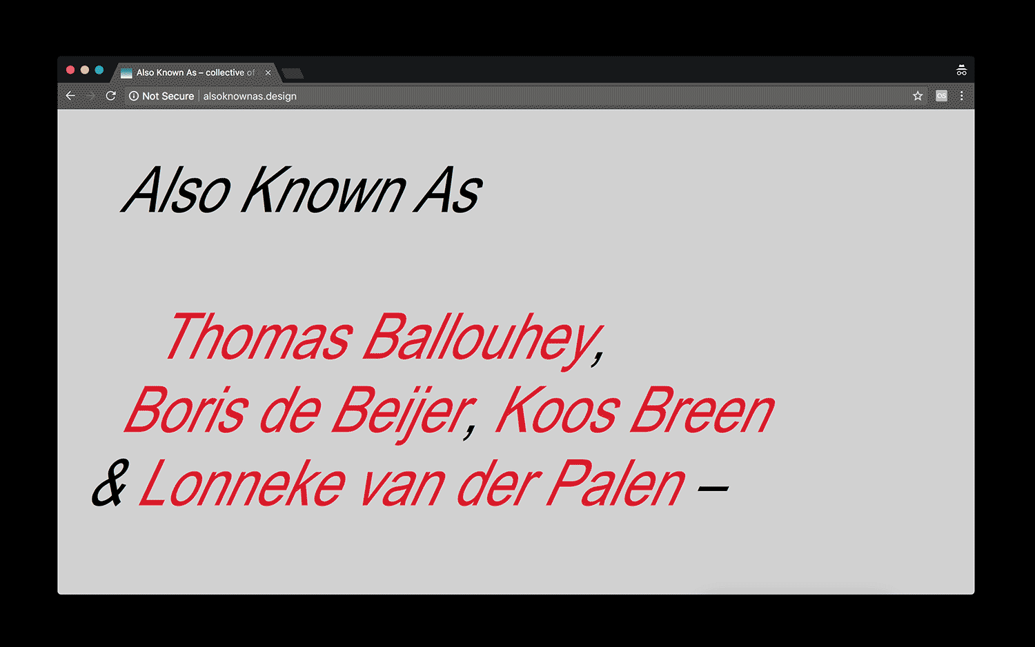 Also Known As is a collective of independent designers, who according to current issues in our professional field, join forces and shape our vision through a collective presentation. With Koos Breen, I designed their website which is an important part of their visual identity.