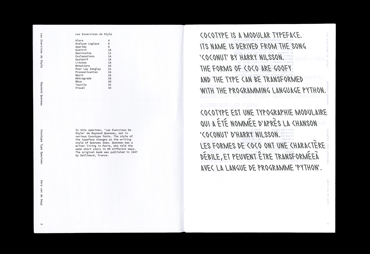 Cocotype is a modular typeface. Its name is derived from the song ‘Coconut’ by Harry Nilsson. The typeface can be transformed in a tool named DrawBot and is made with Python. Although extremely changeable in shape according to various parameters that, Cocotype is goofy in every single form it can appear in.